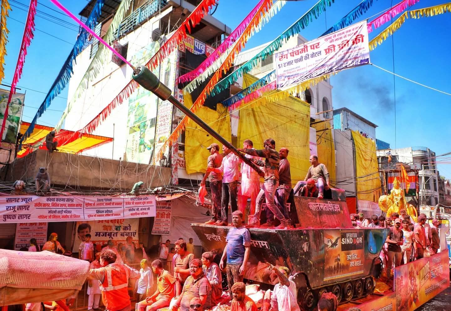 यहां होलकर शासनकाल से चली पारंपरिक गेर में मिसाइलों से गुलाल और टैंकों से रंगों की बौछार हो रही है, जिससे आसमान रंगीन हो गया है। उमंग के रंगों में डूबने के लिए हजारों लोग यहां जुटे हैं।